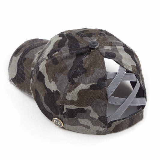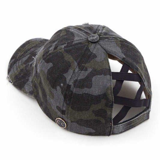 Black Distreeed Camo High Ponytail Cap