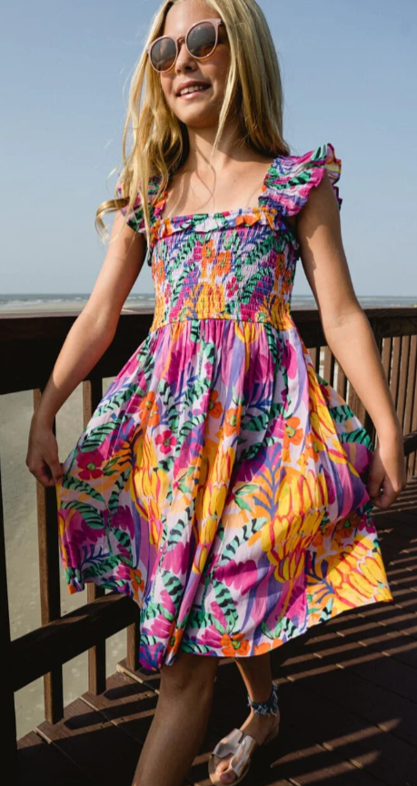This tropical print midi dress features a smocked bodice that adds a touch of sweetness to any outfit. Perfect for your little one to stay cool and stylish during those warm, sunny days.