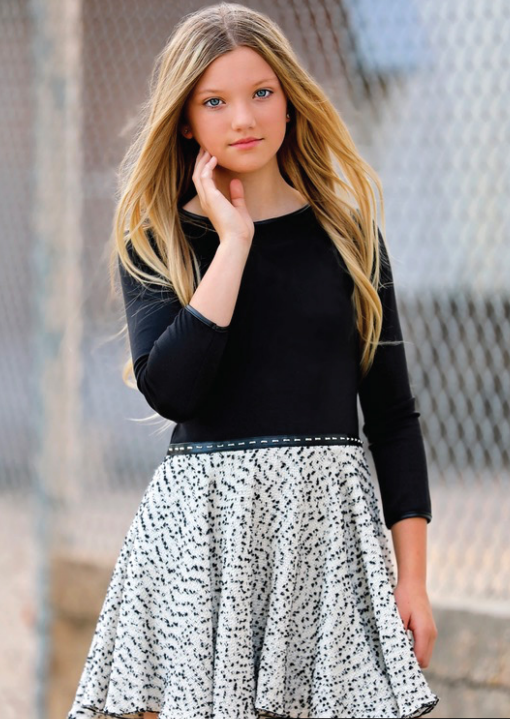 We love this couture dress perfect for a fancy night. Black long sleeve dress with skater skirt with black & ivory boucle. 89% polyester, 7% rayon, 4% spandex