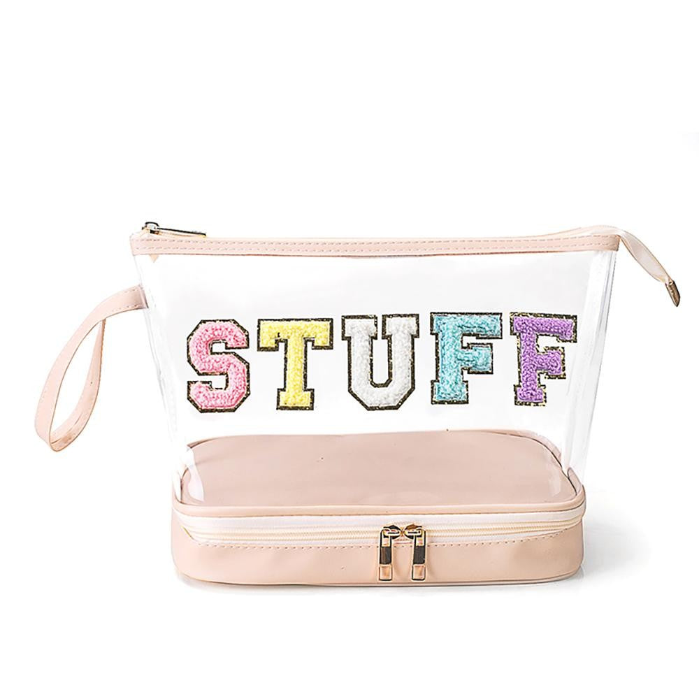 Clear 'Stuff' Chenille Patch Double Layer Makeup Bag With Brush Pocket