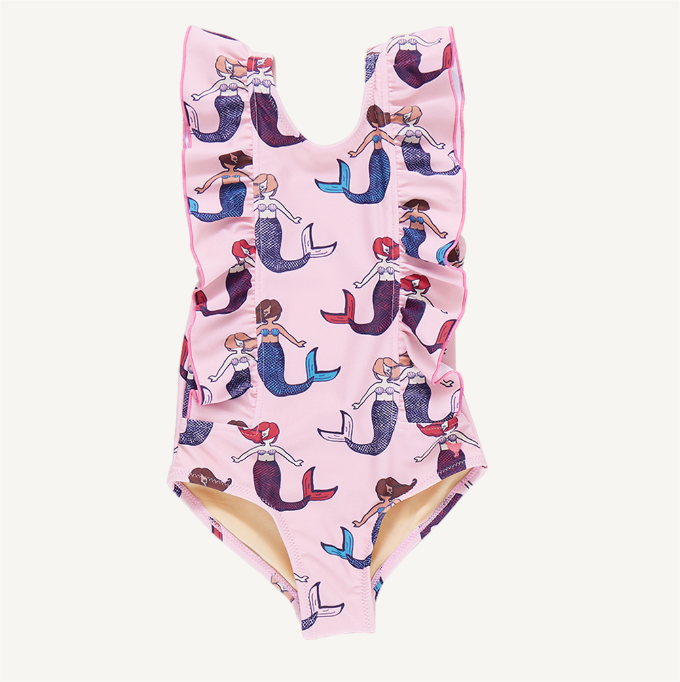Under the Sea! Sweet mermaids swim across a warm pink sea in our delightful Mystical Mermaids print, shown here on our swim collection classic Girls Katniss Suit. A pink tipped pattern on pattern ruffle from shoulder to hip and a low dip in the back add a little extra flare to this fun and fashionable swimsuit.