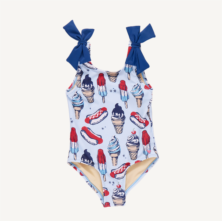 Hot dogs and Ice Cream and Ice Pops Oh My! Our mouth watering Summer Treats conversation print features all of your mid-summer carnival faves in one delectable spot - our Girls Shelly Suit! This versatile scoop neck one piece features playful, decorative navy bows at the shoulders.