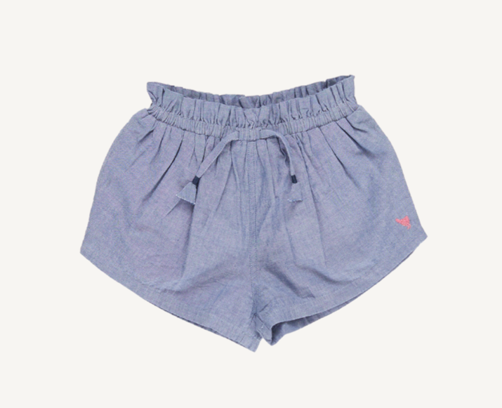 This is the perfect short to have. The ruffled, gathered elastic waist is accented with a faux tassel with navy thread detail.