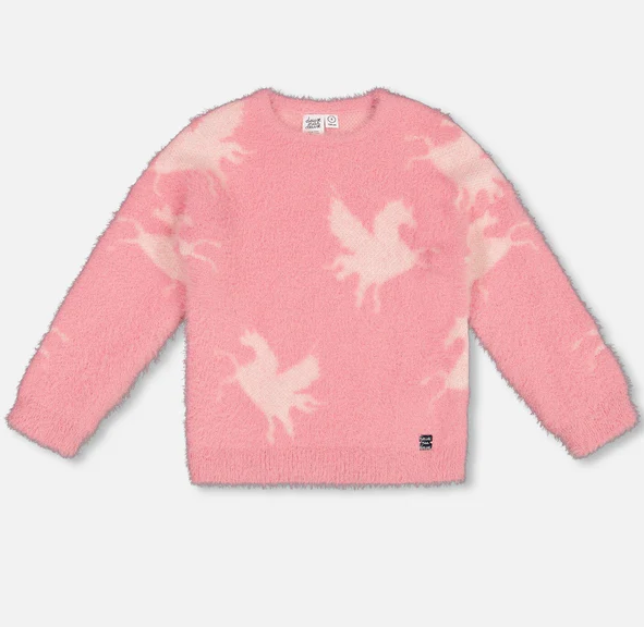 Flying winged unicorns make our Jacquard Unicorn Sweater Hairy Knit Pink a whimsical and colorful addition to any little girl's wardrobe. With a soft and fuzzy texture, this pullover sweater features long sleeves, a round neckline, and a bold allover unicorn pattern. Pair it with leggings, jeans, skirts, or trousers to create a variety of playful cold weather looks!