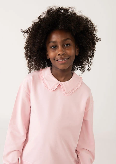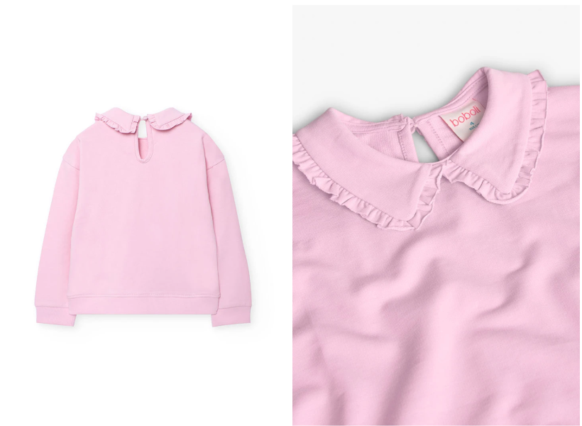 Pink fleece sweatshirt for girls, ideal for the autumn and winter months, made from a soft and warm fabric that provides comfort and warmth. A charming ruffled collar adds an elegant touch to the design. Long sleeves ensure good protection against the cold, while the back closure makes dressing easy