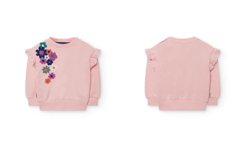 Girls' pink sweatshirt in fleece with floral print, ideal for autumn and winter. Designed to offer warmth and comfort, it features a round neck and long sleeves for a cosy fit.