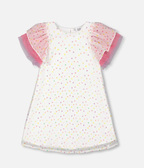 Special occasion even more memorable with our Polka Dot Dress With Mesh White Printed Party Dots. Absolutely darling in a shift silhouette, this dress is a party in itself, with colorful allover polka dots and pop color accents. It's detailed with a comfortable round neck and ruffled and tiered flutter sleeves that add an ultra-girly touch!