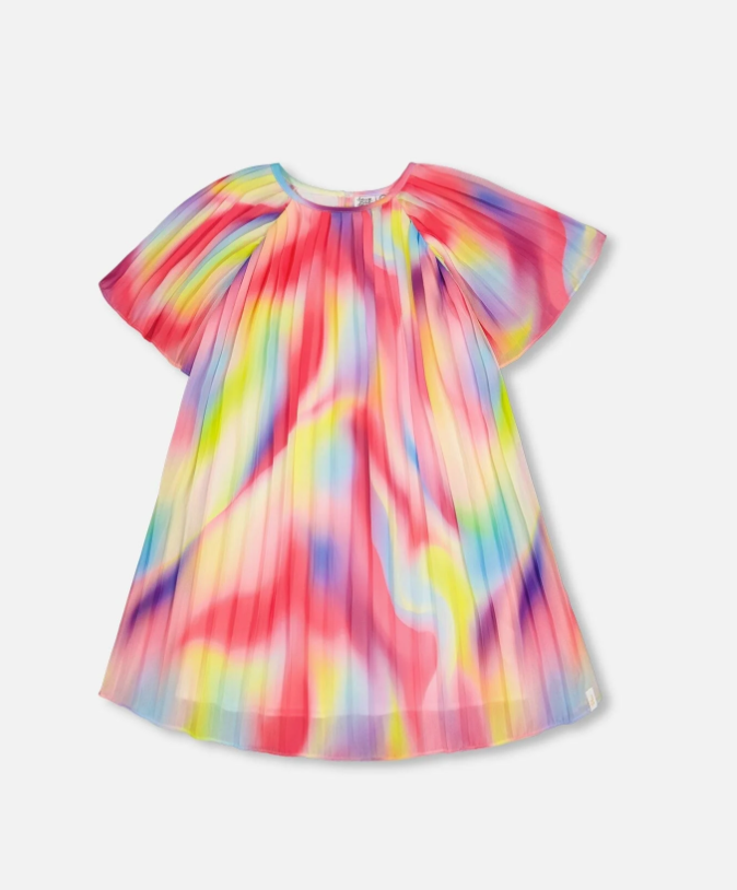Pleated Chiffon Dress Rainbow is a look she'll remember loving as a child decades from now when she's all grown up. Oh-so-colorful with a vibrant allover rainbow print, this dress is made from lightweight pleated chiffon fabric in a swing silhouette with full short sleeves and a round neckline.