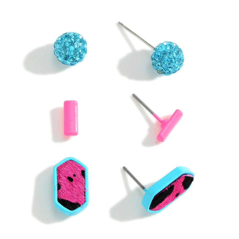 Set of Three Stud Earrings Featuring Rhinestone and Animal Print Accents